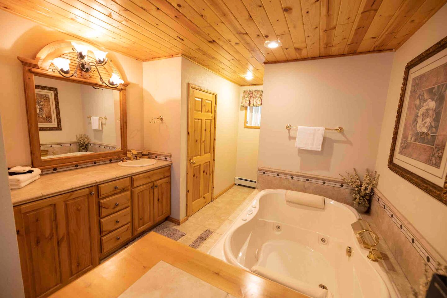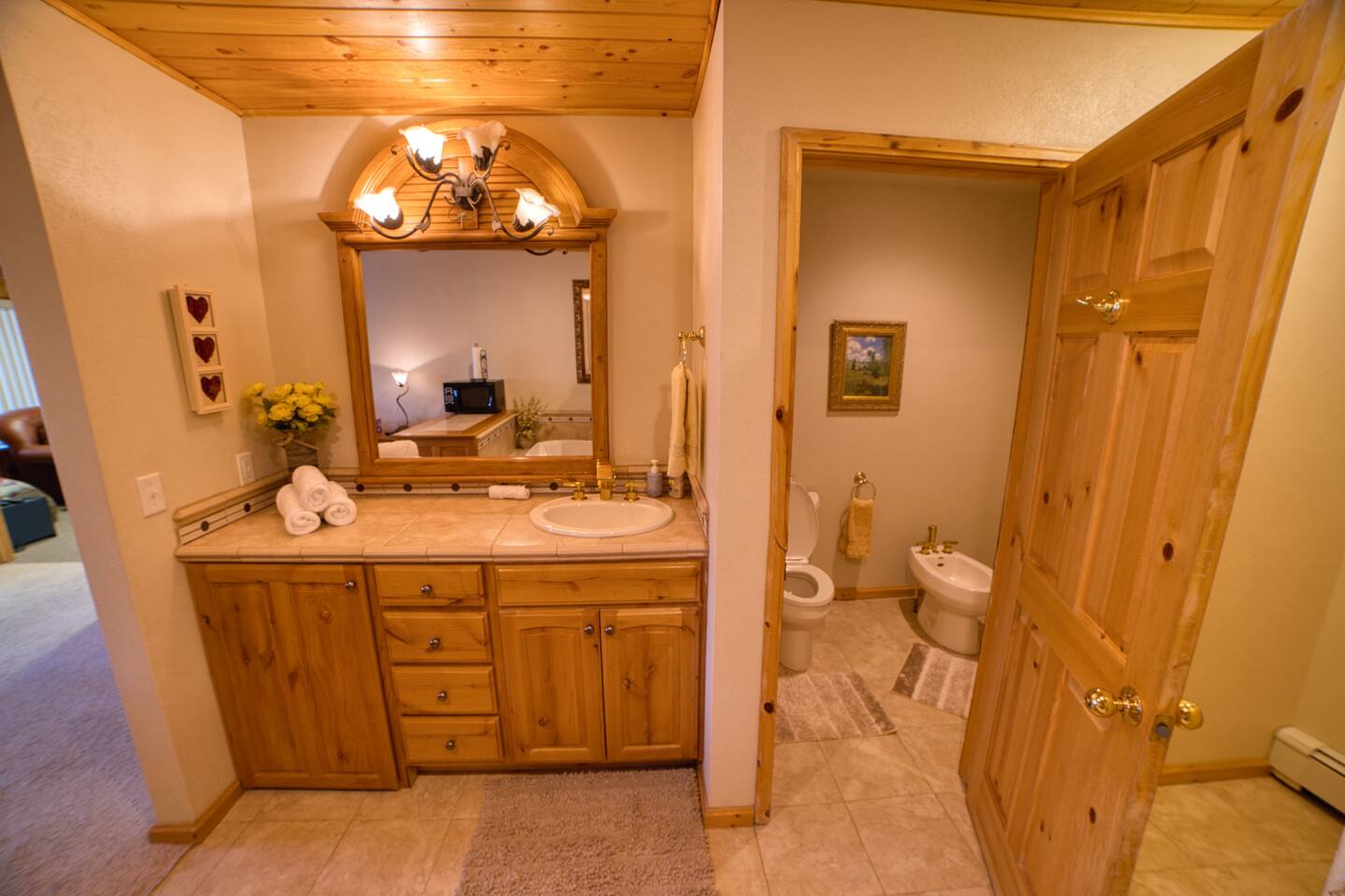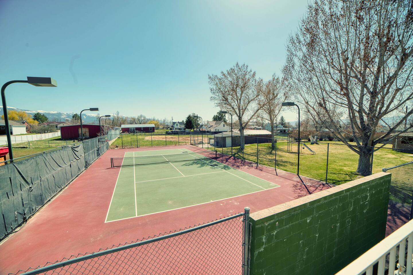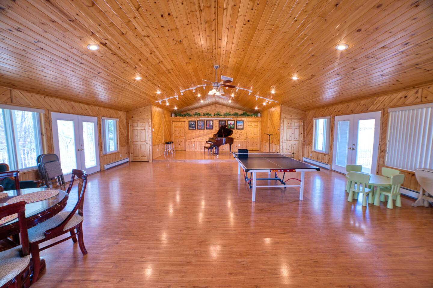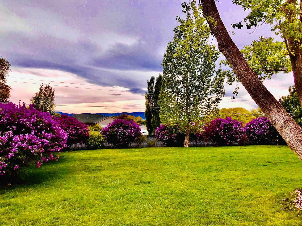 Private king bedroom with ensuite bathroom featuring a jacuzzi and bidet, plus an in-unit washer and dryer. For your entertainment, enjoy a large selection of puzzles. Please note the main entrance is shared with access to the upstairs event area. You’ll also have access to the shared backyard, game room, hot tub, and cleaning closet. My cleaner may stop by between 11 a.m. and 4 p.m. to restock supplies. Sports enthusiasts can enjoy the tennis court on a first-come, first-served basis—please bring your own rackets and balls. Ping pong is also available upstairs in the shared space. Feel free to play fetch with Sadie, our friendly farm dog, in the backyard.